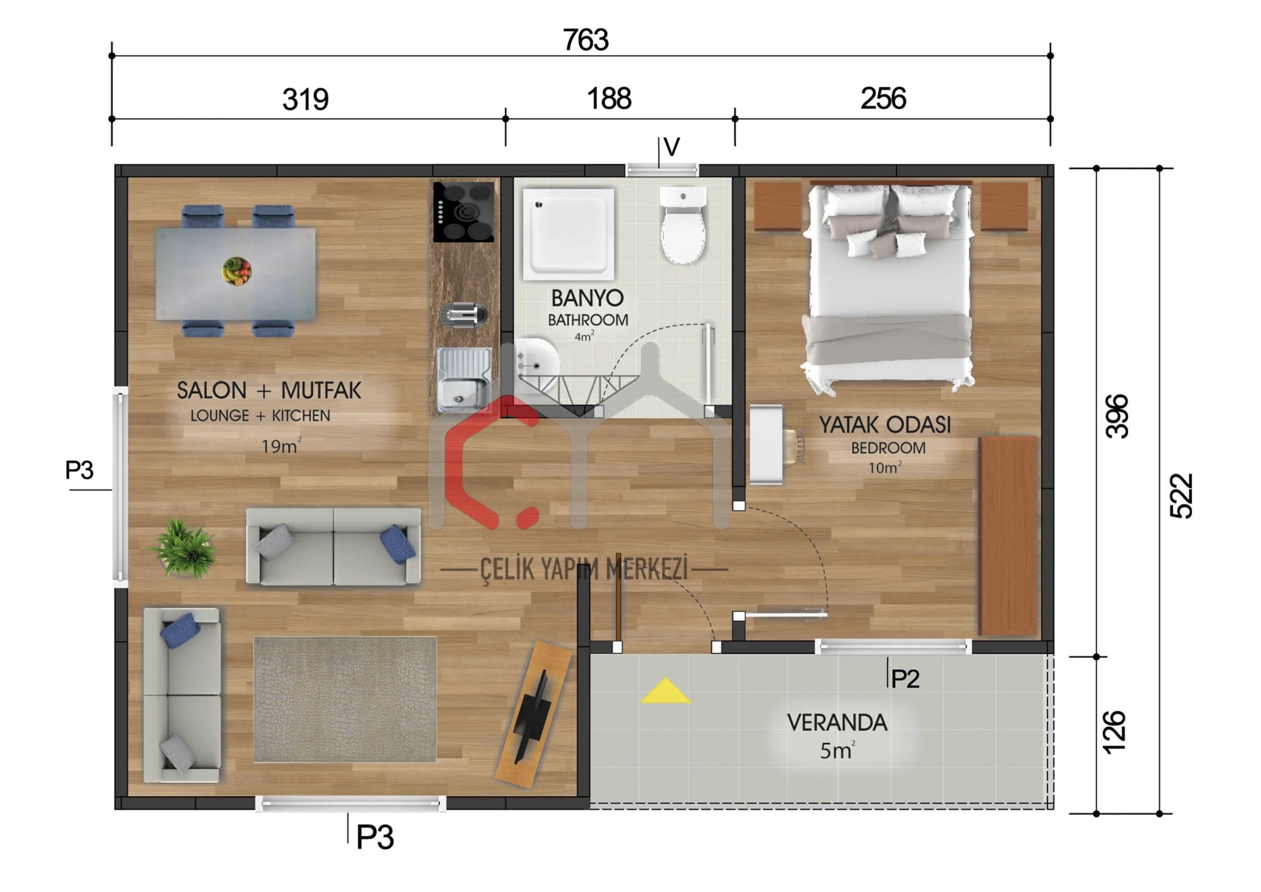 Yataq otağı sadə və funksional şəkildə dizayn edilib, qonaq otağı və mətbəxin birləşdirilmiş quruluşu isə həm estetik, həm də erqonomik görünüş təmin edir. Banyo və veranda kimi dəstəkləyici sahələr sayəsində ev kiçik ölçüsünə baxmayaraq həyat keyfiyyətindən güzəştə getmir.