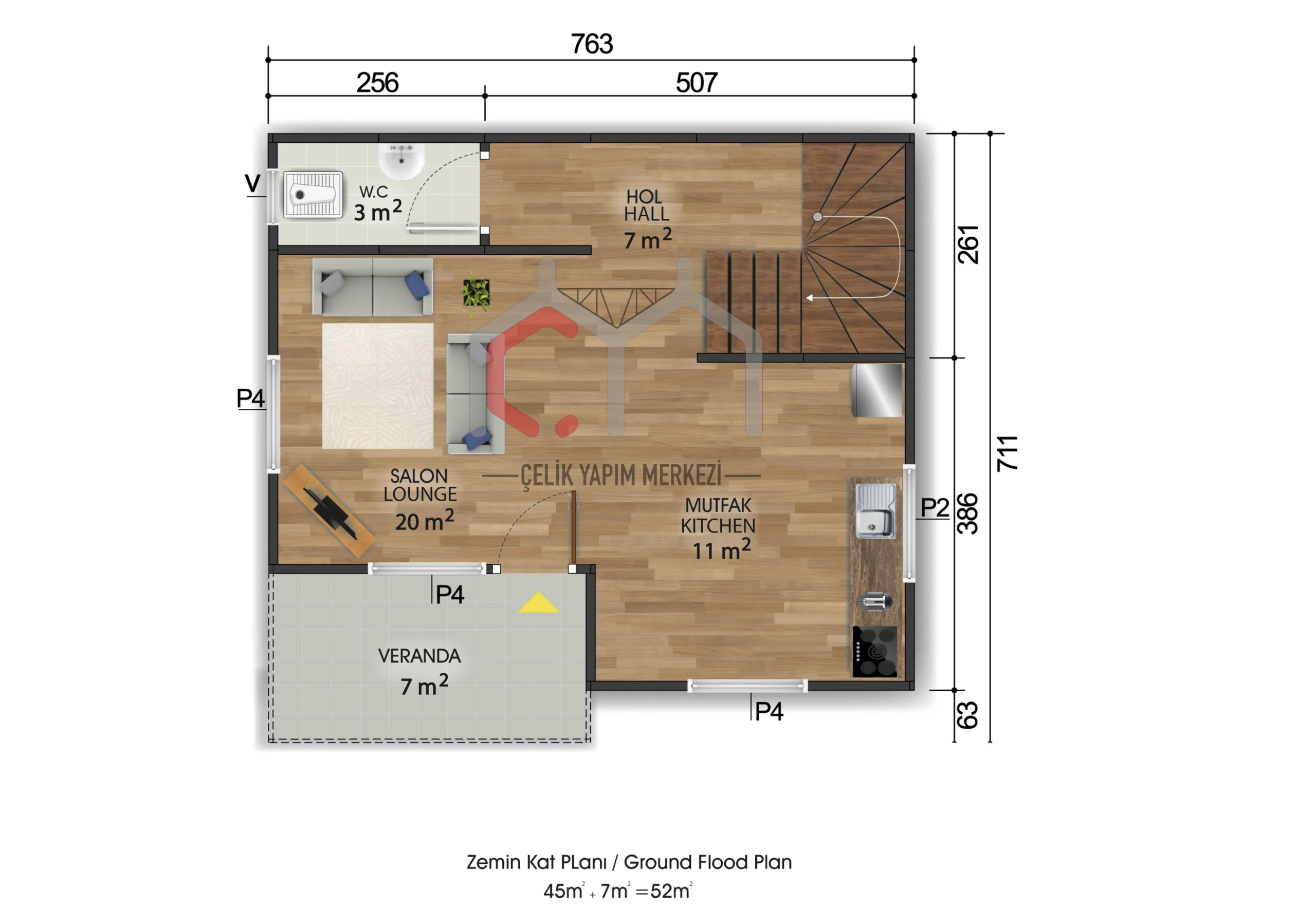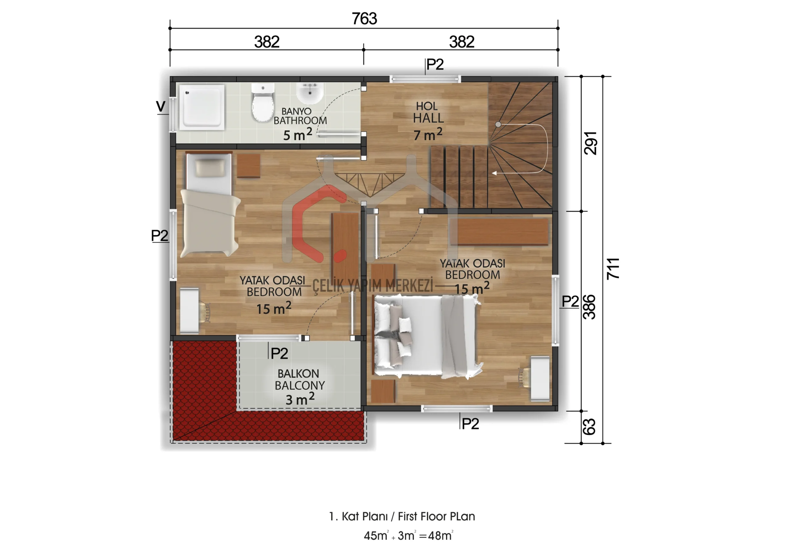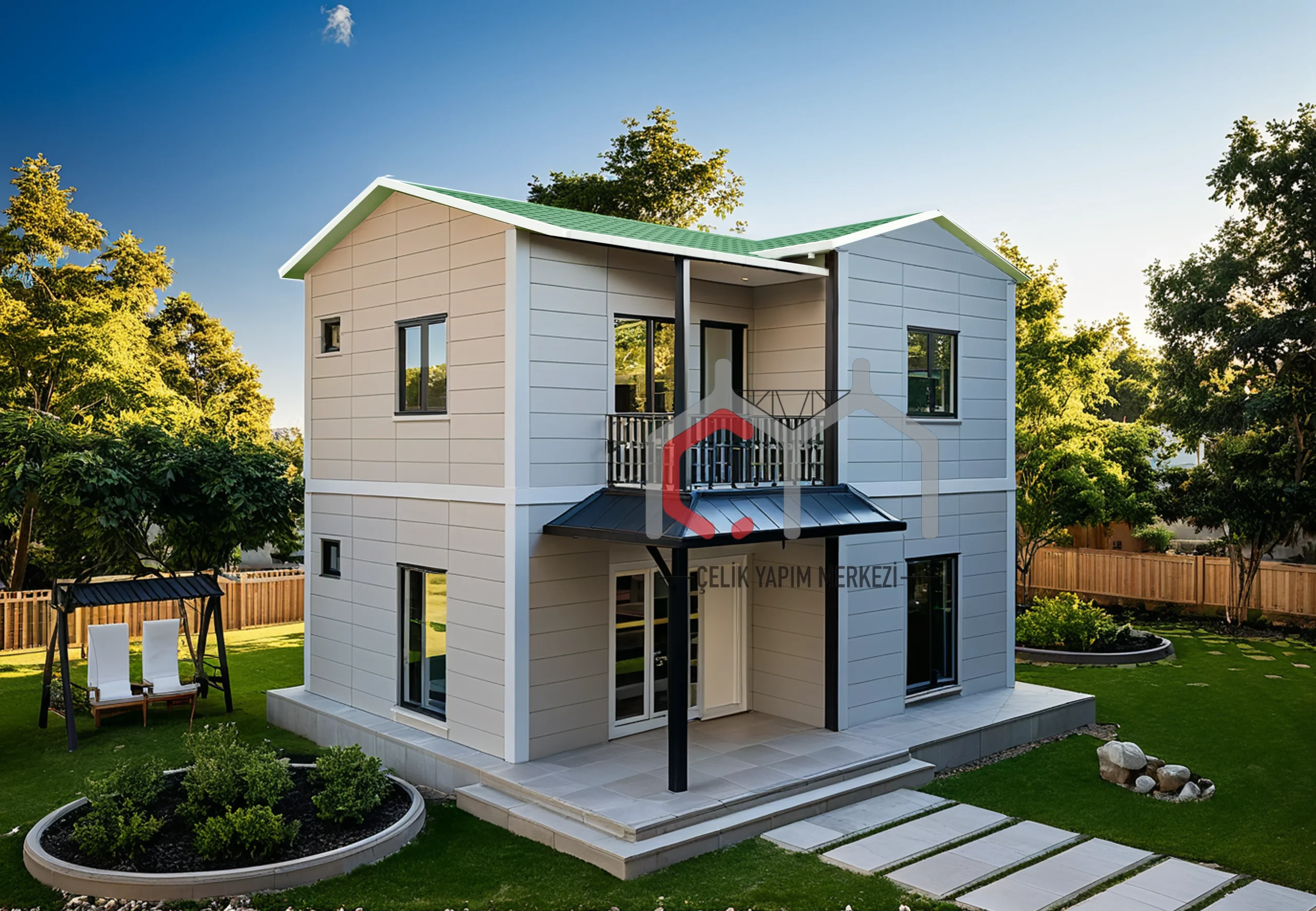 100 m2 sahəni əhatə edən, 2+1 ölçülü iki mərtəbəli bu prefabrik evin birinci mərtəbəsində geniş qonaq otağı və mətbəx, yuxarı mərtəbəsində isə iki rahat yataq otağı və balkon var. Möhkəm polad konstruksiyası, izolyasiya edilmiş divarları və müasir interyer tərtibatı ilə həm ailə həyatı, həm də yay istifadəsi üçün uyğundur.