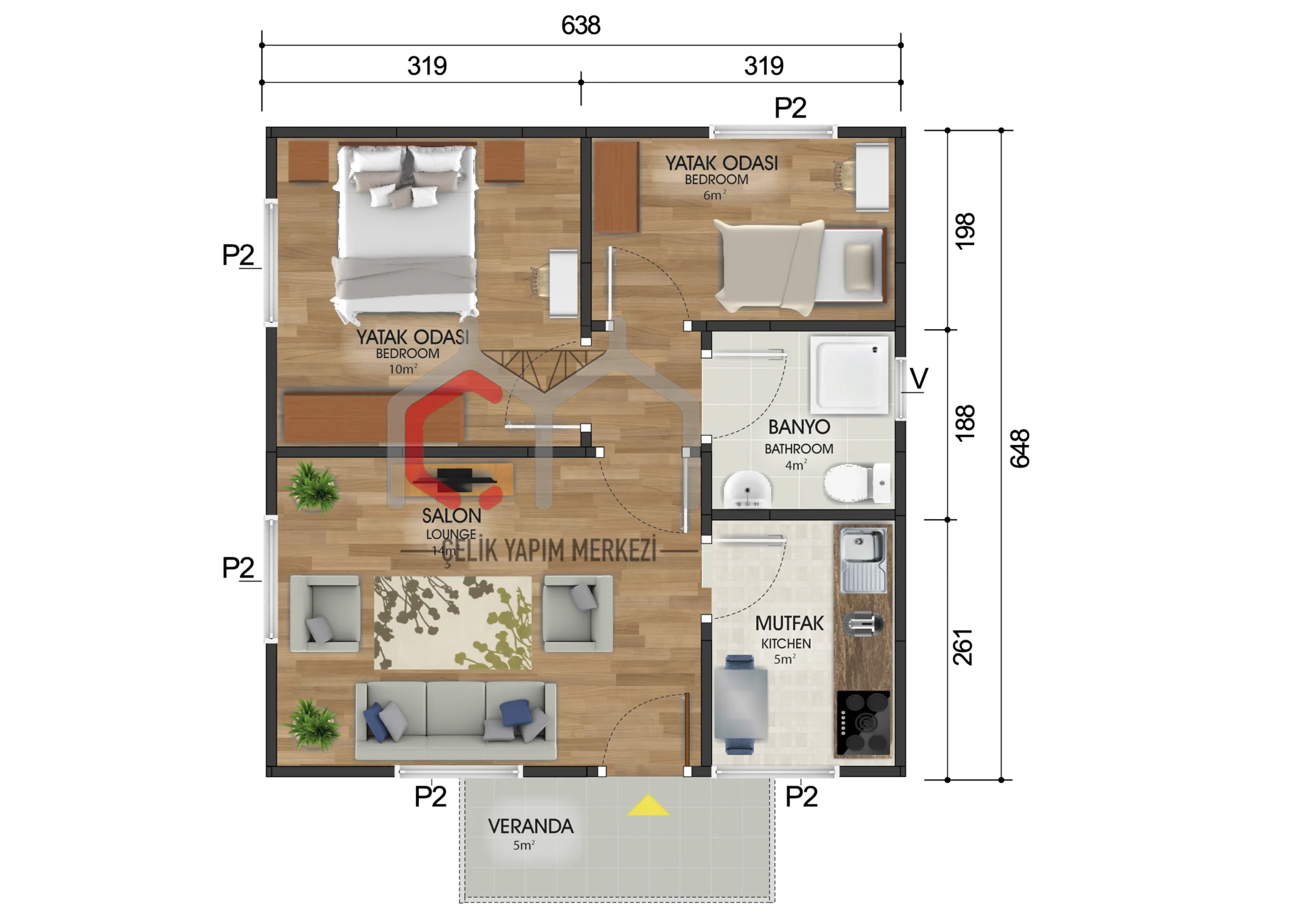 45 m2 sahəni əhatə edən, 2+1 ölçülü, tək mərtəbəli prefabrik ev, ayrıca mətbəxi, geniş qonaq otağı və iki yataq otağı ilə kiçik ailələr üçün rahat yaşayış sahəsi təklif edir. Estetik dizaynı və funksionallığı ilə seçilir.