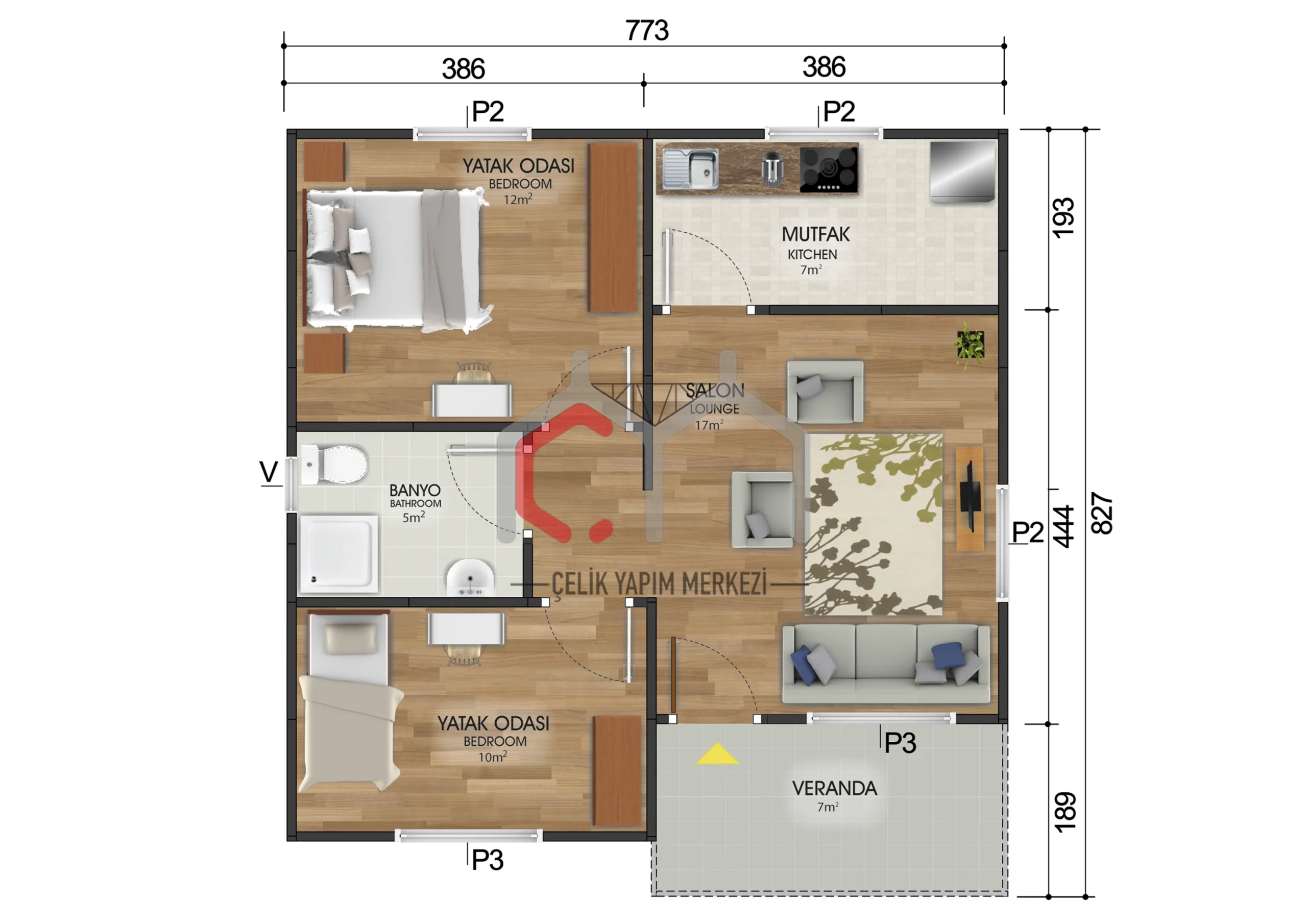 Geniş 17 m2 qonaq otağı gündəlik həyat üçün sosial atmosfer yaradır, iki ayrı böyük yataq otağı isə həm məxfilik, həm də rahatlıq təklif edir. Mətbəx və vanna otağı sahələri istifadəçinin gündəlik ehtiyaclarına yönəlmiş erqonomik şəkildə planlaşdırılıb. Veranda açıq hava fəaliyyətləri üçün ideal bir tamamlayıcı məkan təmin edir.