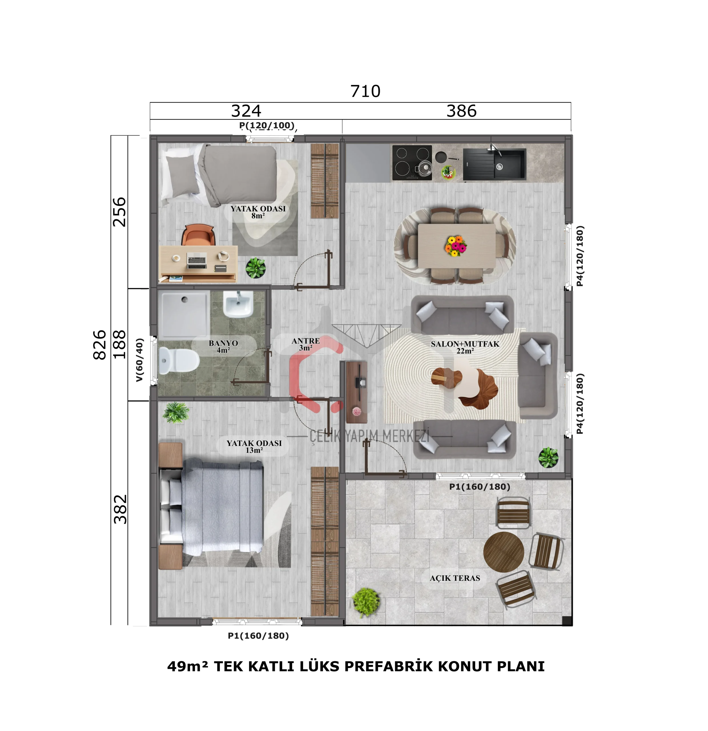 Funksional planı və estetik dizaynı ilə 49 m2 sahəni əhatə edən, 2+1 ölçülü tək mərtəbəli prefabrik villa kiçik ailələr və ya yay evi axtaranlar üçün mükəmməl seçimdir. Açıq terras, geniş qonaq otağı və mətbəx, eləcə də iki yataq otağı ilə həm şəhərdə, həm də təbiətdə rahat yaşayış təklif edir.