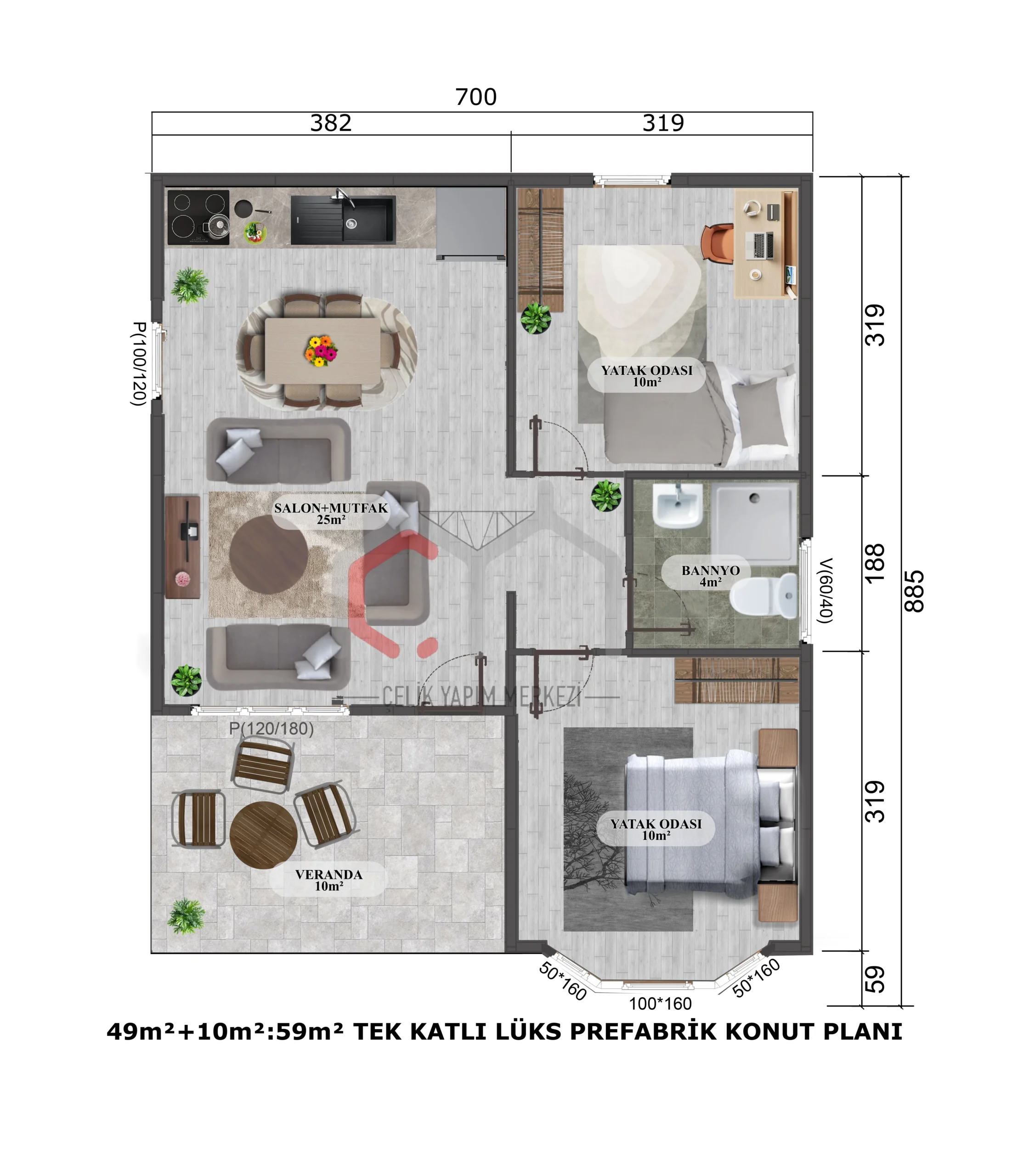 Çelik Yapım Merkezinin müasir villa seriyasının bir hissəsi olan bu 59 m² 2+1 tək mərtəbəli prefabrik villa modeli həm estetik, həm də funksionallığı özündə birləşdirir. Açıq planlı qonaq otağı və mətbəx planı, təbii işığa imkan verən pəncərələr və geniş veranda dinc bir yaşayış mühiti təmin edir.