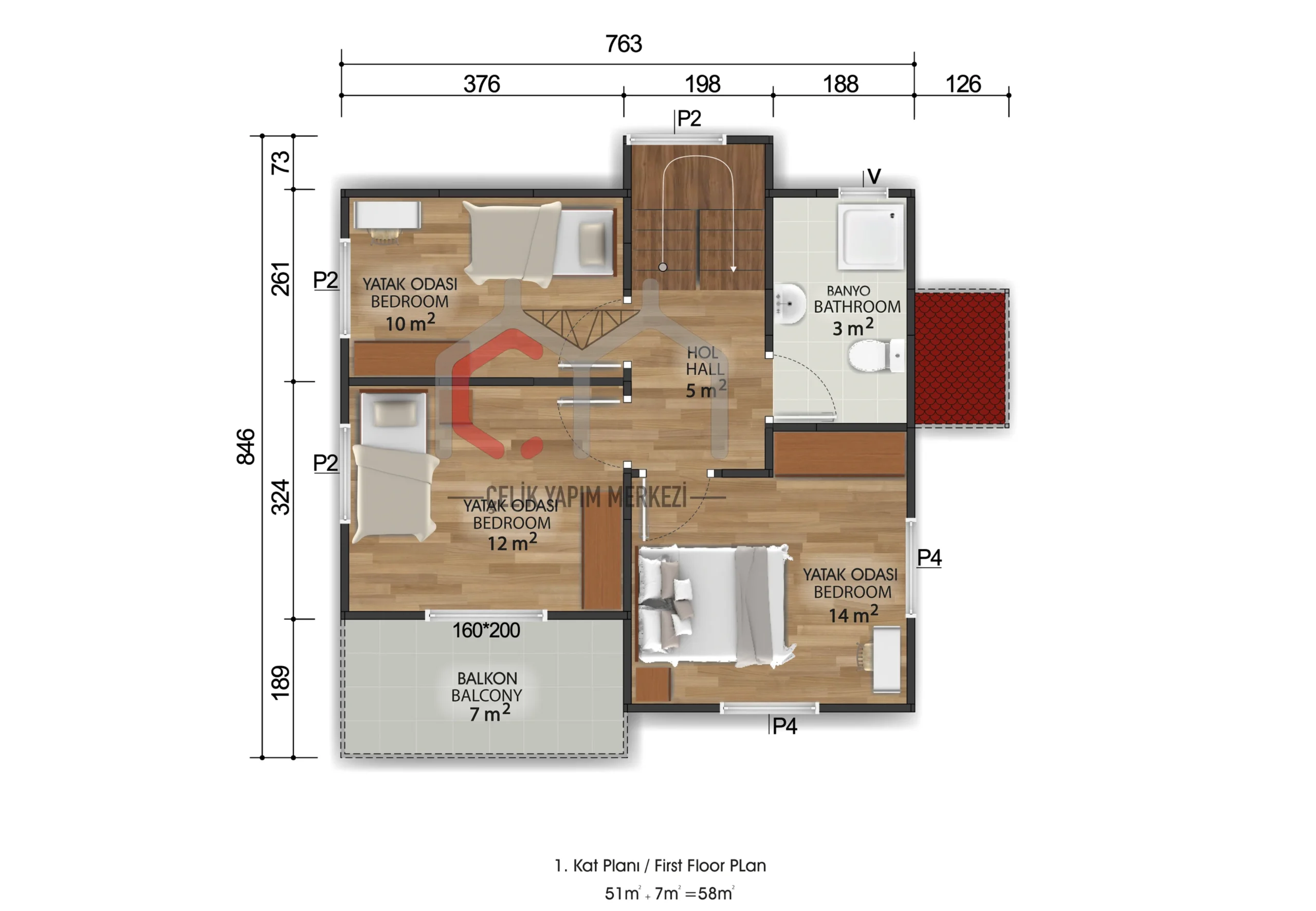 3+1 İki Mərtəbəli Prefabrik Ev 118 m2