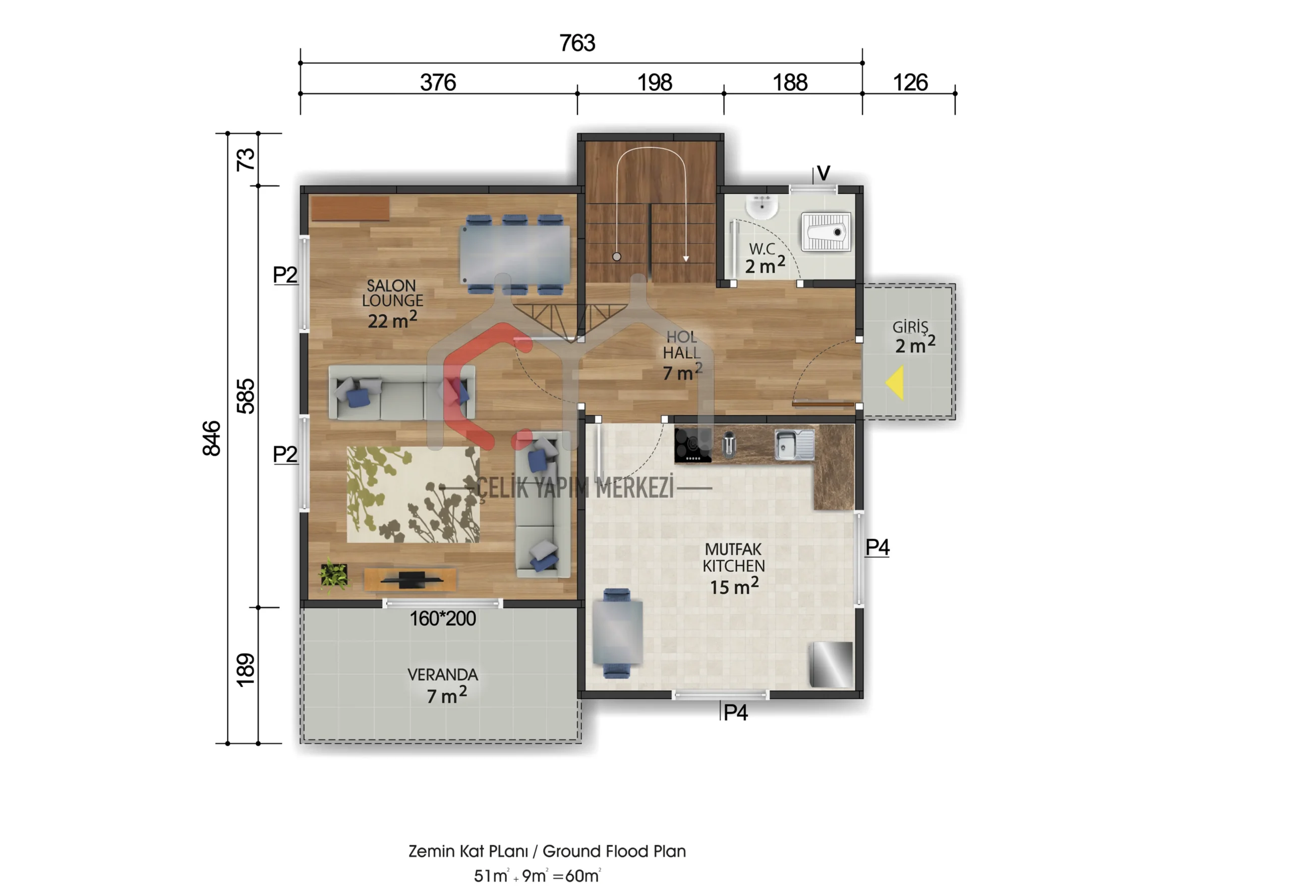2+1 İki Mərtəbəli Prefabrik Ev 82 m2