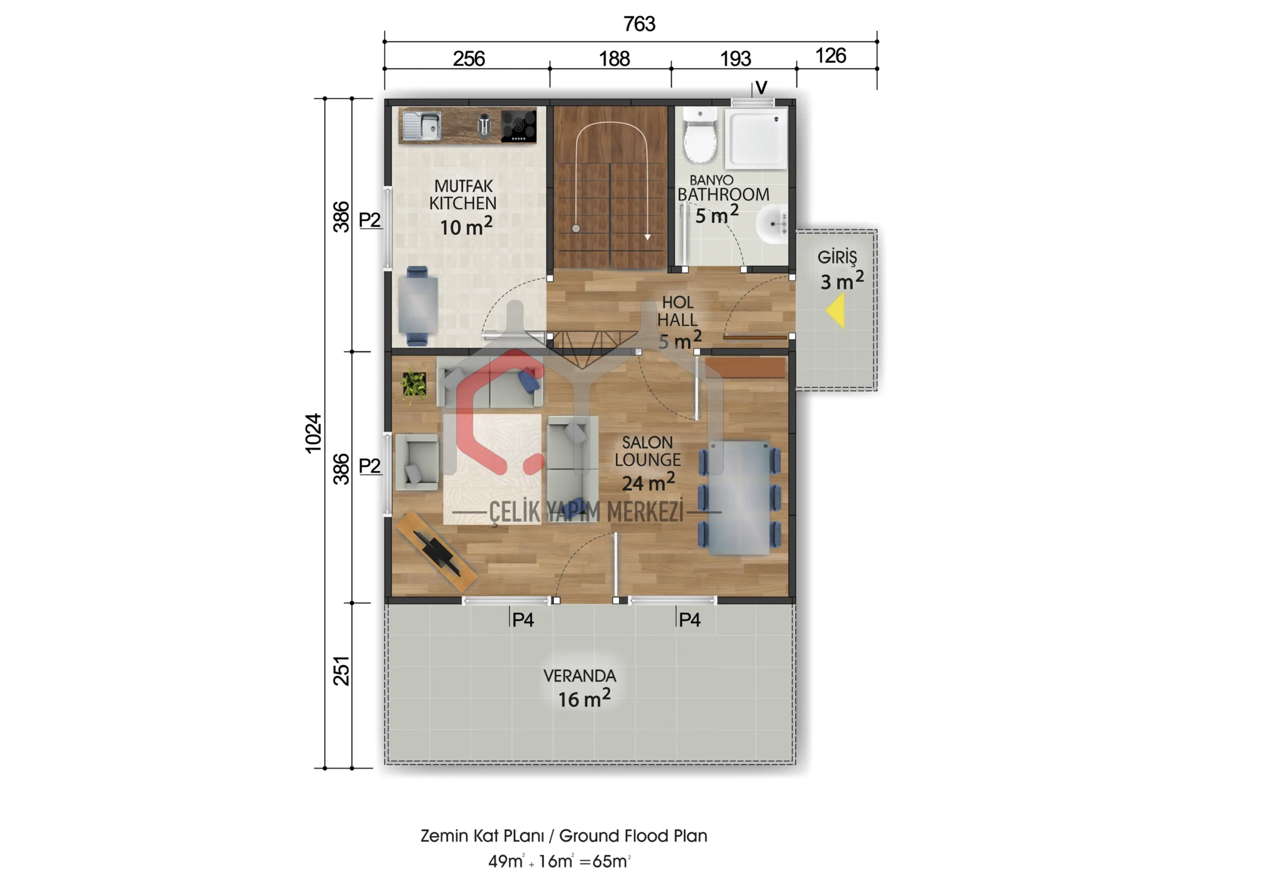 3+1 yataq otağı planına malik bu 120 m2 sahəli, iki mərtəbəli prefabrik ev geniş qonaq otağı, müasir mətbəx və 16 m2 veranda təklif edir ki, bu da həm içəridə, həm də açıq havada havadar bir yaşayış sahəsi təmin edir. Təhlükəsiz quruluşu və iqtisadi üstünlükləri onu böyük ailələr üçün ideal hala gətirir.