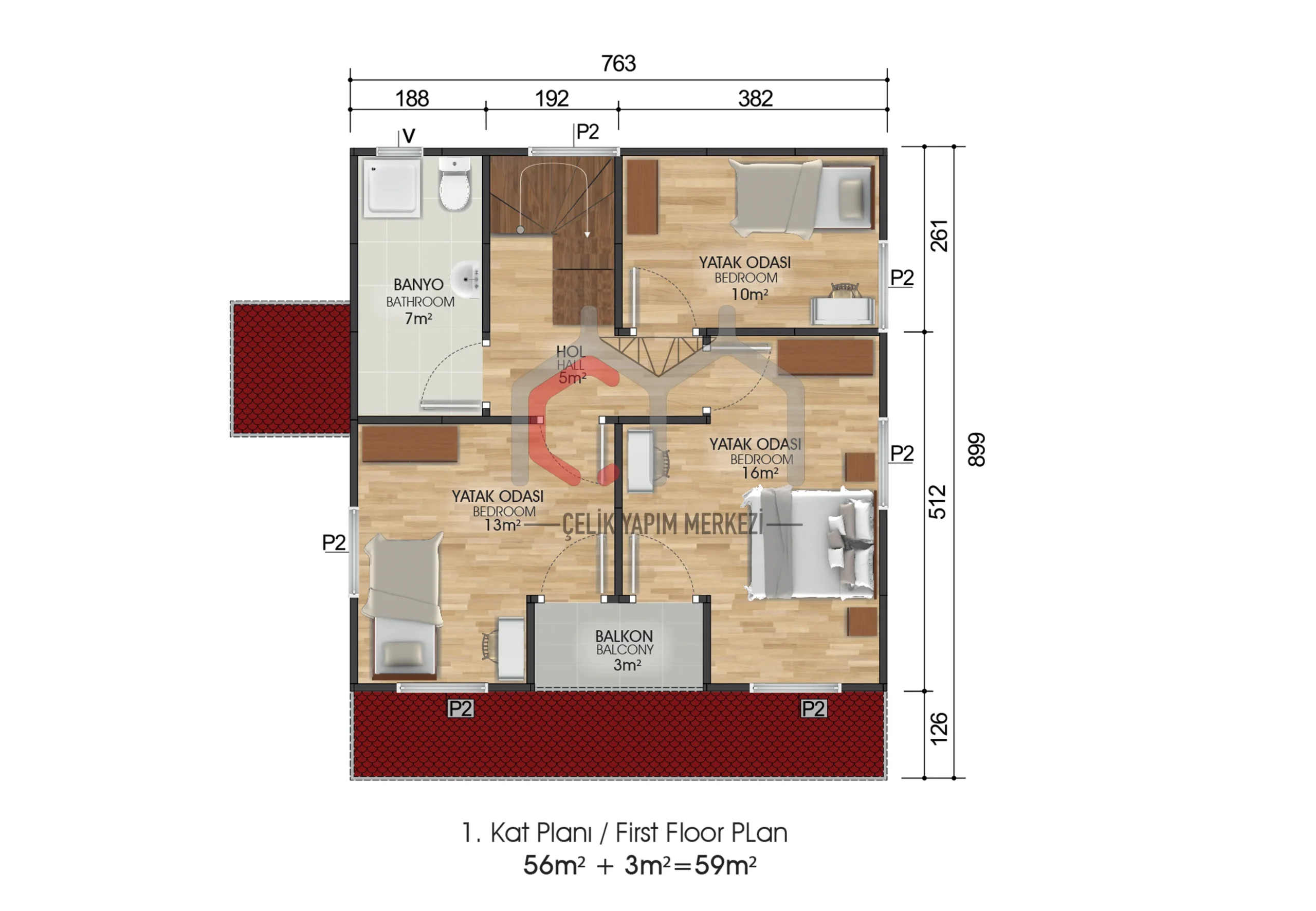| Ümumi Sahə | 131 m2 (54 m2 Birinci Mərtəbə + 59 m2 Birinci Mərtəbə + 18 m2 Veranda və Balkon) |