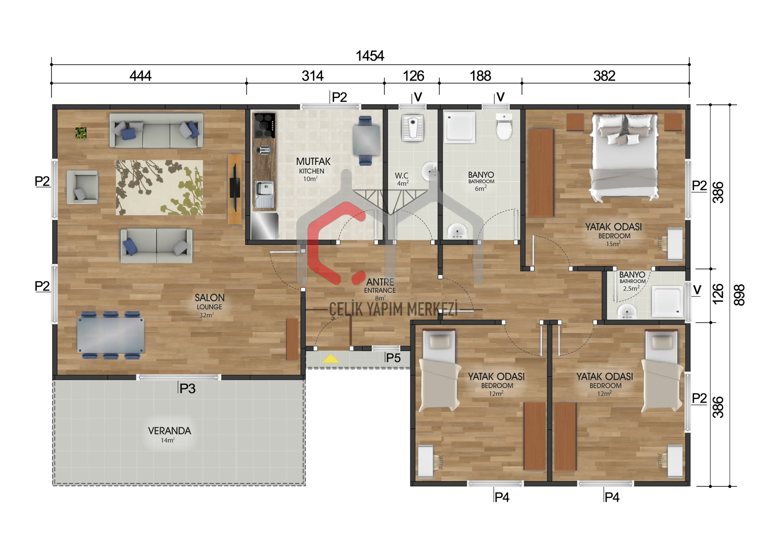 123 m2 sahəni əhatə edən, 3+1 ölçülü prefabrik ev geniş qonaq otağı, böyük yataq otaqları və müasir mətbəxi ilə böyük ailələr üçün estetik cəhətdən xoş və rahat yaşayış sahəsi təklif edir. Açıq hava verandası təbii yaşayış təcrübəsini tamamlayır.