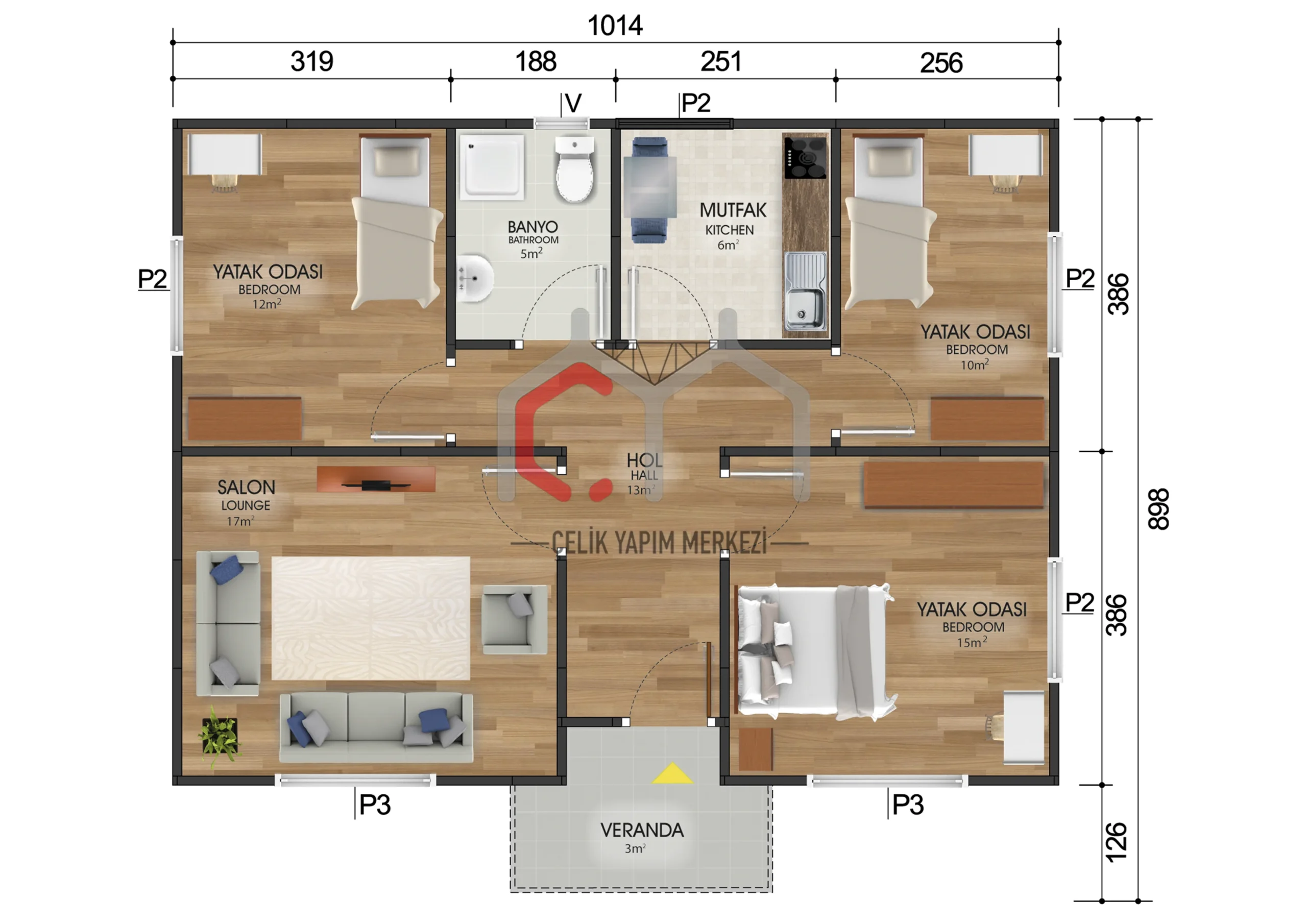 82 m2 sahəyə malik, 3+1 ölçülü, tək mərtəbəli prefabrik ev, praktik yaşayış planı və iqtisadi quraşdırılması ilə böyük ailələrin ehtiyaclarını ödəmək üçün nəzərdə tutulmuşdur. Məkan optimallaşdırılması sayəsində həm ümumi sahələr, həm də fərdi yaşayış sahələri geniş saxlanılır. Bu model, sürətli quraşdırma üstünlüyü ilə şəhərdən uzaqda yaşamaq istəyənlər üçün ideal bir həll təklif edir.