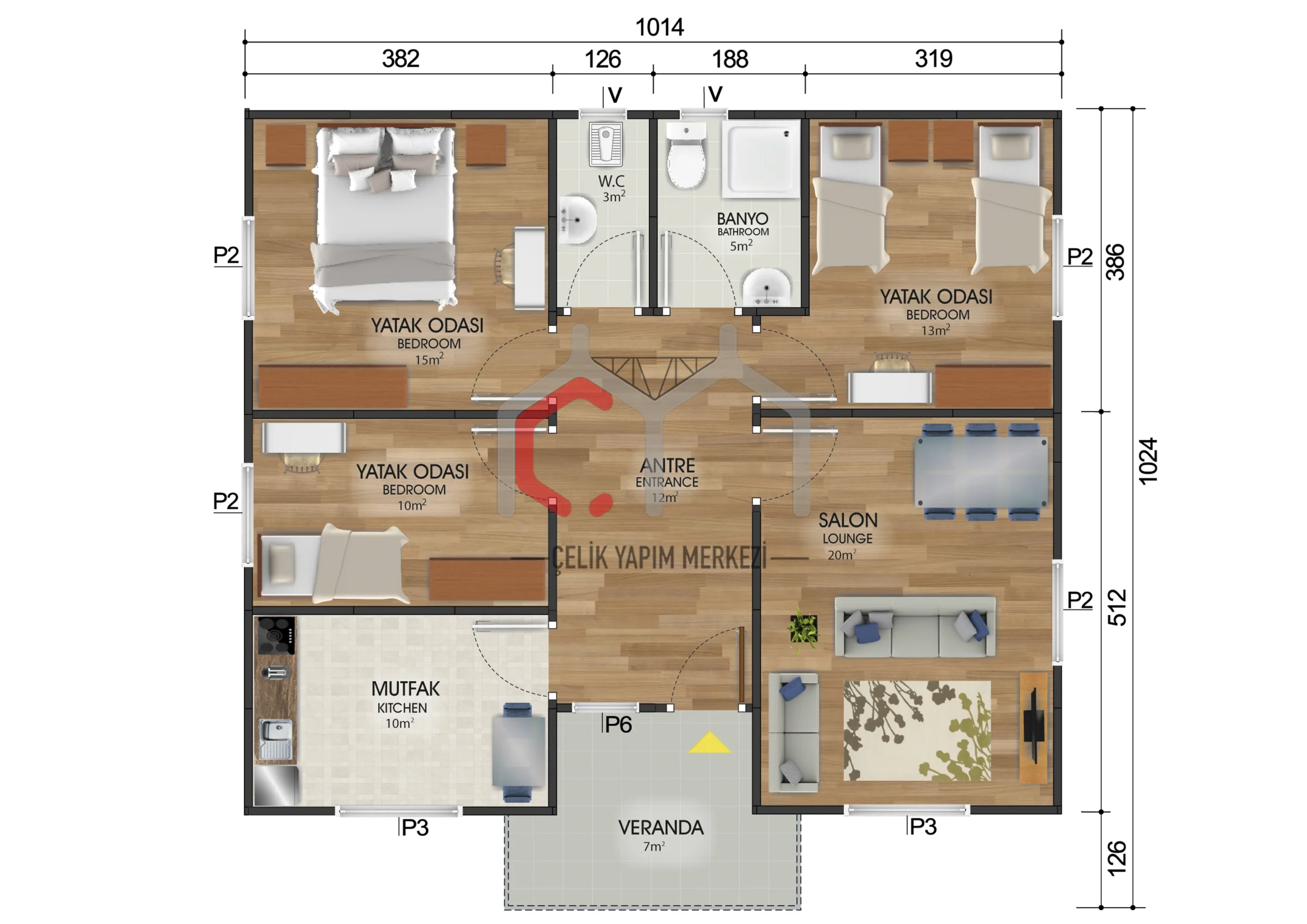 96 m2 sahəyə malik, 3+1 ölçülü bu tək mərtəbəli prefabrik ev modeli müasir dizaynı, funksional daxili tərtibatı və iqtisadi qiymət üstünlüyü ilə seçilir. Xüsusilə böyük ailələr üçün hazırlanmış bu model həm gündəlik həyat, həm də kənd yaşayış planları üçün ideal bir quruluş təklif edir. Qonaq otağı, üç yataq otağı, rahat mətbəx və veranda sahəsi ilə bütün ehtiyacları ödəyir.