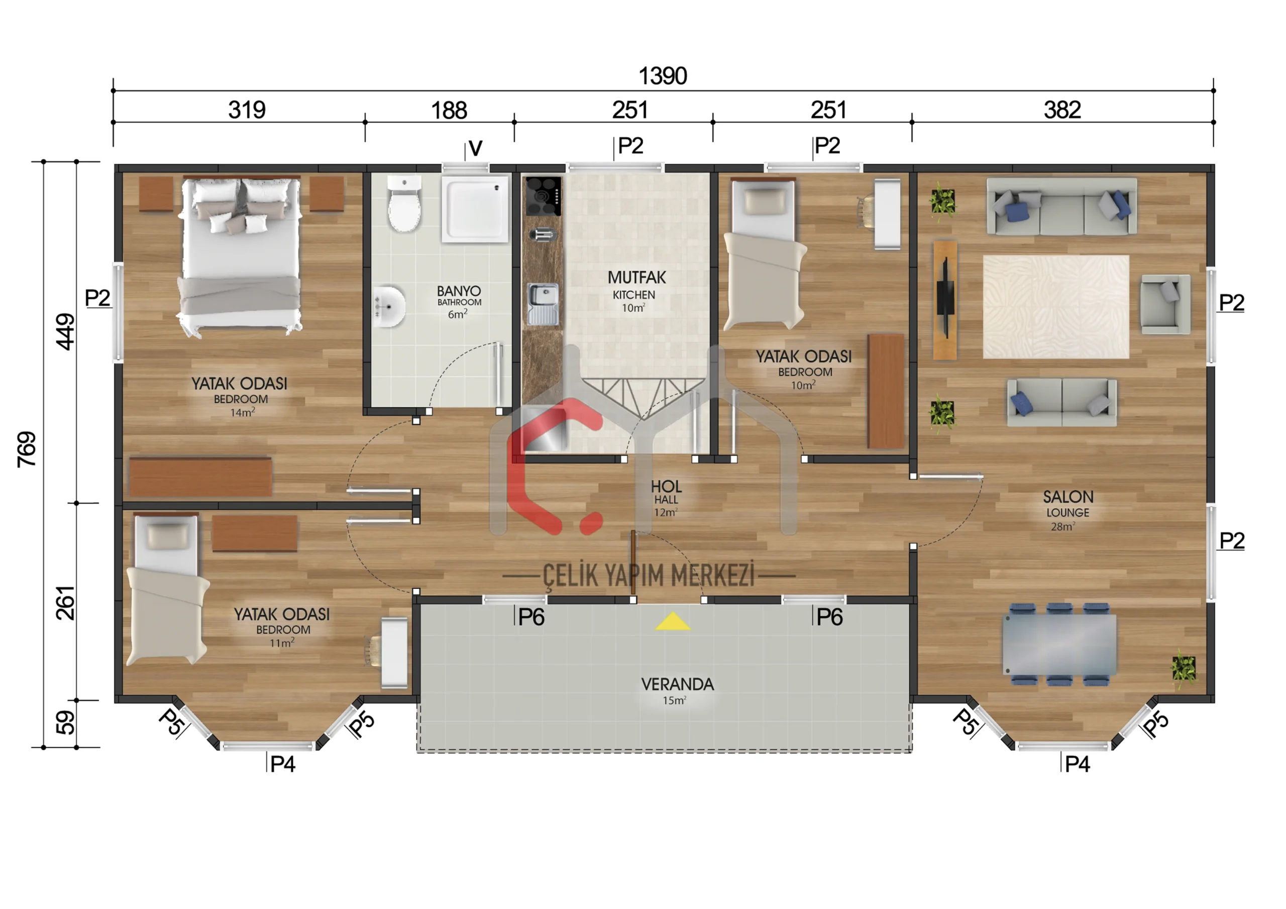 98 m2 sahəni əhatə edən, 3+1 ölçülü tək mərtəbəli prefabrik ev, geniş qonaq otağı və geniş verandası ilə müasir həyatın bütün ehtiyaclarını qarşılayan balanslaşdırılmış daxili tərtibat təklif edir. Estetik xarici görünüşü, davamlı konstruksiyası və münasib qiyməti ilə seçilən bu model, böyük ailələr və ya açıq havada vaxt keçirməyi sevən istifadəçilər üçün idealdır.