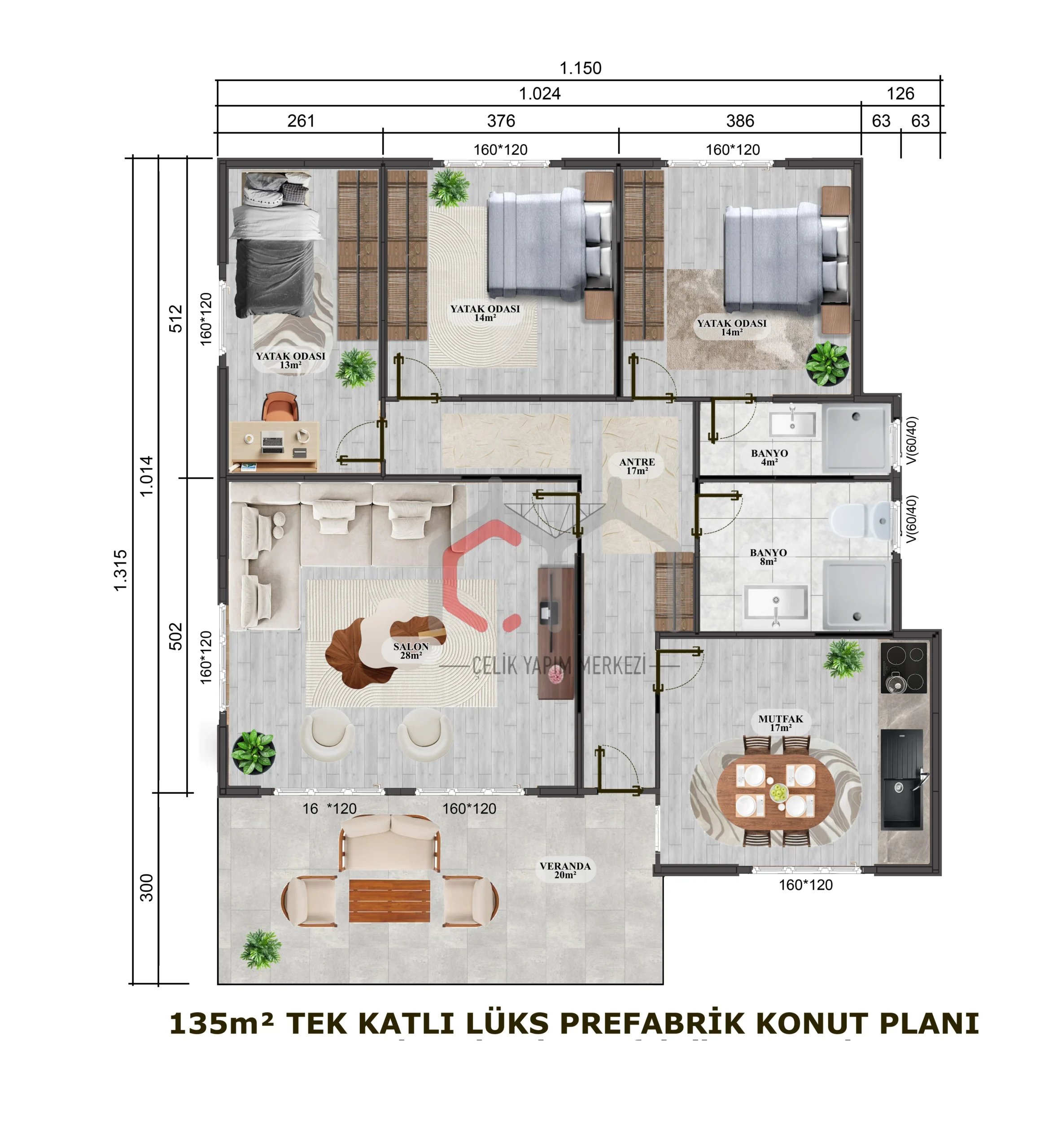 3 yataq otağı və 1 qonaq otağı olan 135 m² sahəli bu tək mərtəbəli prefabrik villa, üç geniş yataq otağı, iki vanna otağı, havadar qonaq otağı, ayrı mətbəx və 20 m² verandası ilə ailələr üçün rahat və müasir yaşayış təklif edir. Yüksək izolyasiya xüsusiyyətləri, zəlzələyə davamlı polad çərçivə sistemi və estetik dizaynı ilə seçilir.
