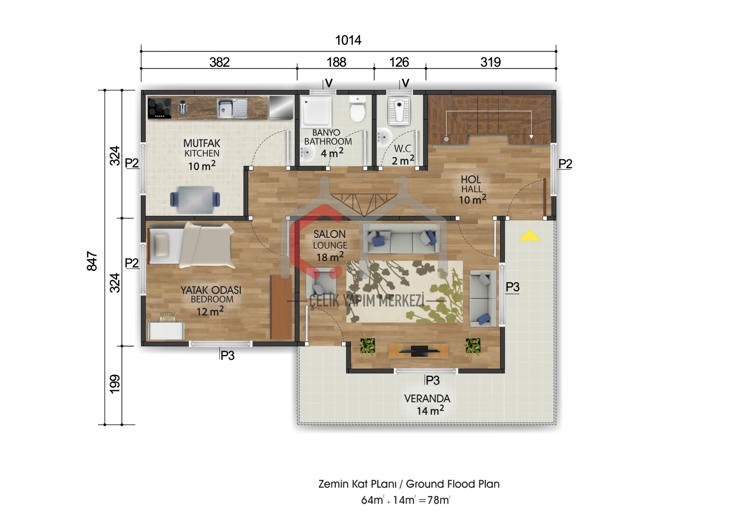 2+1 Tək Mərtəbəli Prefabrik Ev 81 m2
