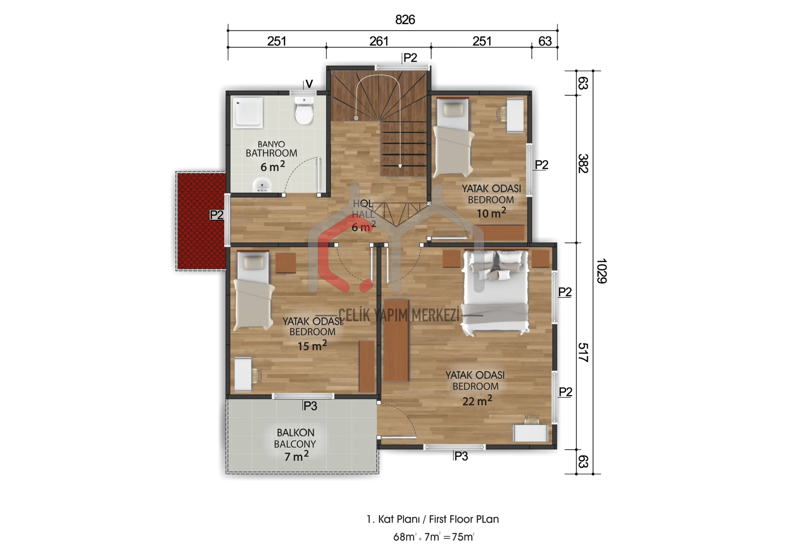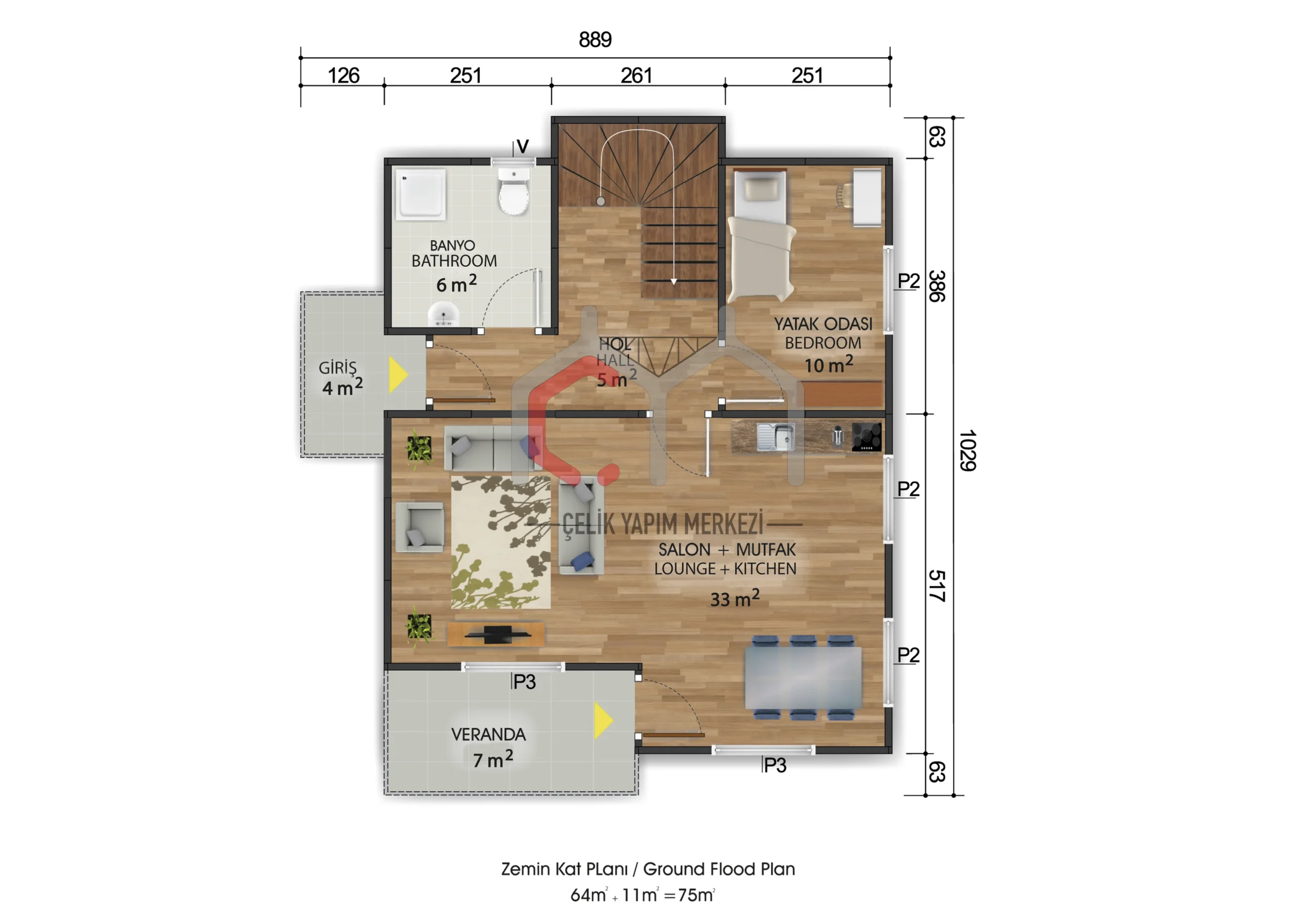 2+1 İki Mərtəbəli Prefabrik Ev 82 m2